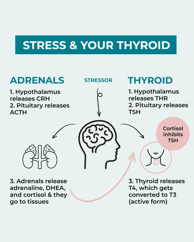 An underactive thyroid (hypothyroid) can occur due to nutrient deficiencies, gut and absorption issues, reduced antioxidant capacity, inflammation, and more. The adrenal glands that manage stress are linked to thyroid functions through the brain’s hippocampus-pituitary-thyroid (HPT) axis (pathway). Chronic stress hormones redirect energy resources to the brain and muscles and tell your metabolism to slow down – counteracting the balancing act of the thyroid hormones.